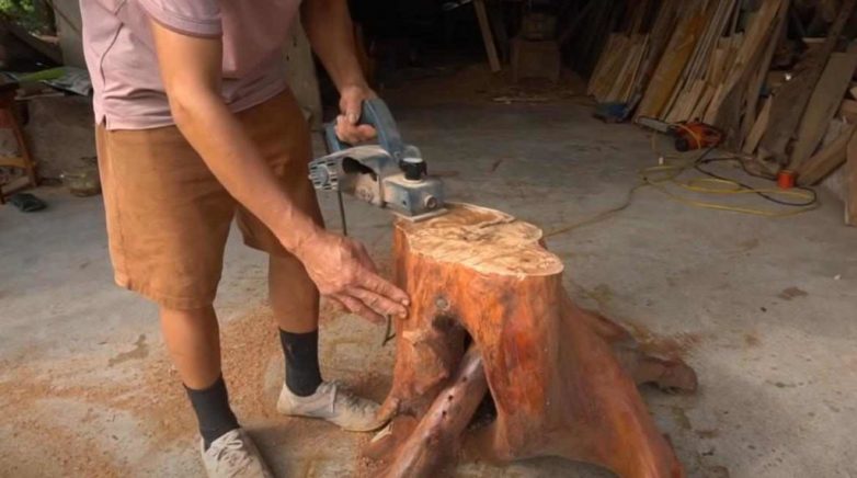 В данном случае автор использовал старый выкорчеванный пень с толстыми корнями. Бензопилой срезаем макушку до необходимой высоты, после чего выравниваем поверхность с помощью электрорубанка.