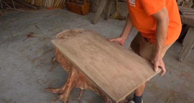 В завершении останется только соединить столешницу с опорной ножкой, в роли которой и выступает деревянная коряга.