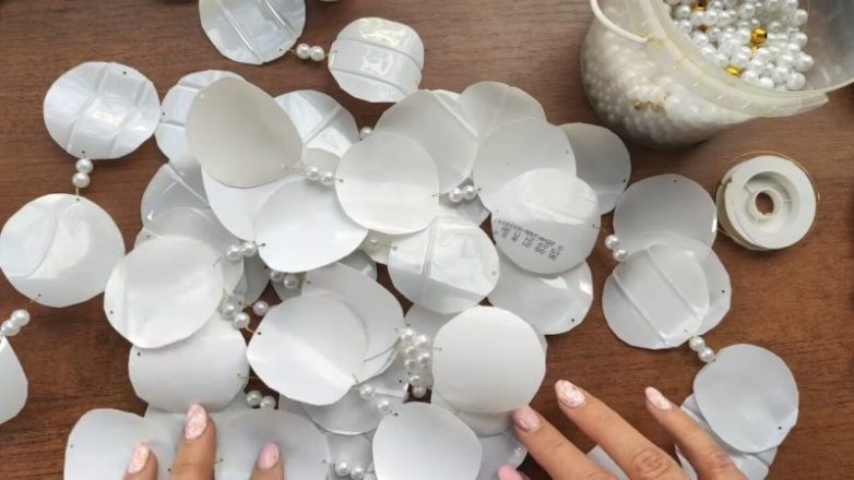 Соединить все кружочки с помощью лески, между «лепестками» вставлять по две бусины.