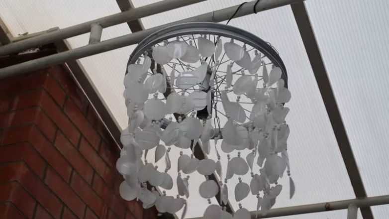 Установите патрон и лампу, подвесьте. Очень необычный и практически бесплатный светильник для дачи!