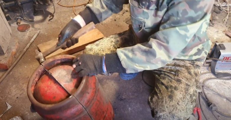 Маленький баллон выступает в качестве теплообменника. Чтобы дым не уходил напрямую, внутрь него нужно вварить металлическую перегородку. Предварительно надо разрезать баллон (не до конца) при помощи болгарки. В самой пластине нужно просверлить отверстие для лучшей тяги при розжиге печки.