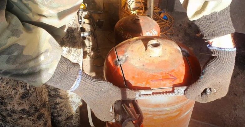 В маленьком газовом баллоне (на 27 литров) вырезаем два круглых отверстия, которые должны быть на одном уровне по высоте. Иными словами, должны быть соосны друг другу.