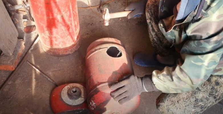 Подготавливаем газовые баллоны к резке: выкручиваем вентили, наполняем водой и только после этого можно начинаем орудовать болгаркой.