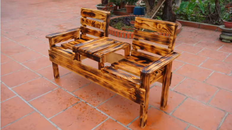 Финально скамью покрываем краской или, как в нашем случае, опаляем горелкой, закрепляем все защитным лаком или пропиткой для дерева и готово!