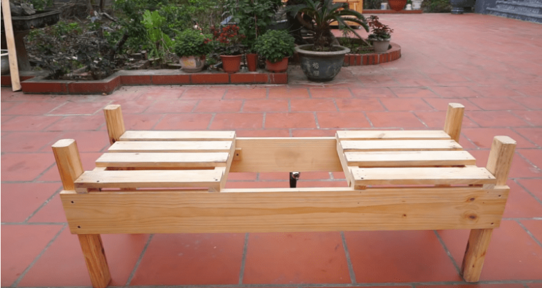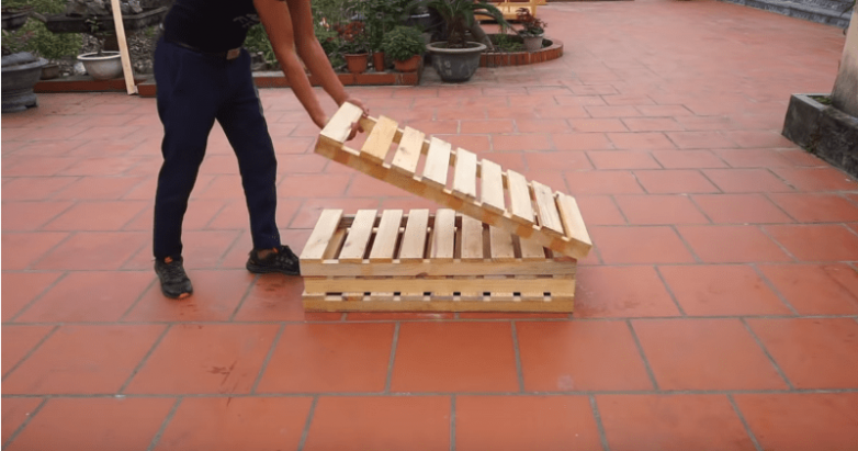 Далее из досок или разобранных паллет сбиваем подобие нар — это каркас скамьи. На него устанавливаем сиденья — квадратные заготовки, оставляя между ними место для будущего стола.