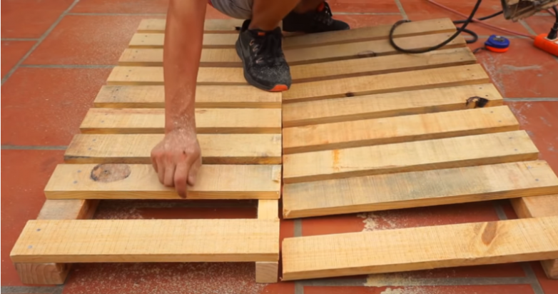 Если для работы вы используете паллету, то на первом этапе ее просто размечаем и разрезаем на 4 заготовки подходящего размера. Если нет, то собираем необходимые детали из доски.