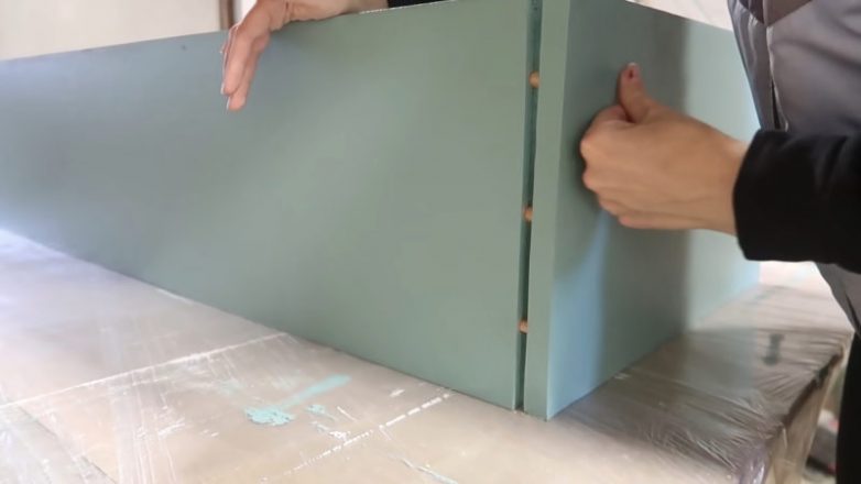 Для сбора каркаса потребуются мебельные шканты. Соедините с их помощью боковые стенки и дно с крышкой.