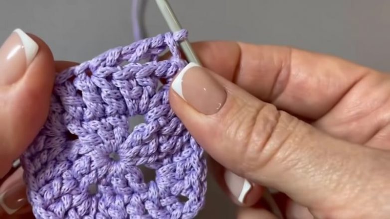 Заканчиваем двумя ВП, затягиваем кольцо и присоединяемся к началу вязания (соединительная петля в первые ВП), чтобы закрыть первый ряд. Теперь набираем 3 ВП и между столбиками предыдущего ряда провязываем ССН, а в арку между столбиками предыдущего ряда — вяжем 2 ССН + 2 ВП. Сюда же, в эту же арку вяжем ещё 2 ССН. Это получается уголок квадрата.