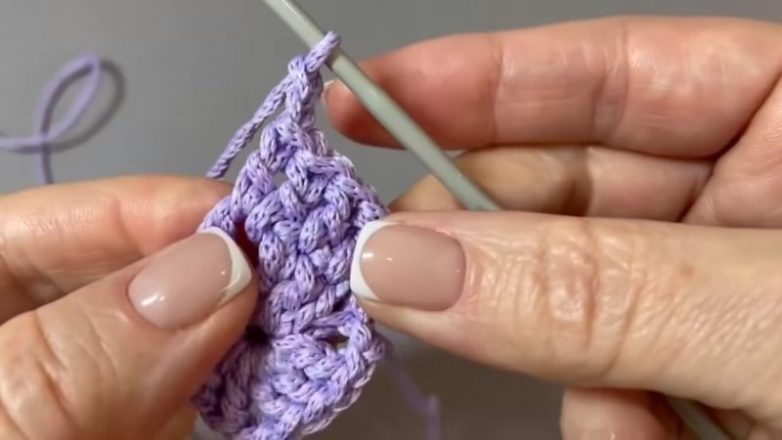 С другой стороны теперь повторяем то же самое, но в обратном, зеркальном порядке. Останется только отрезать шнур, присоединиться и спрятать пряжу в вязании.