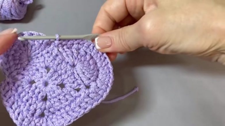 В следующие обычные петли провязываем по одному ССН. А, дойдя до следующей арки между 3 столбиками предыдущего ряда, снова вяжем 2 ССН + 2 ВП + 2 ССН. Так продолжаем вязать до конца ряда. В конце делаем соединительную петлю, чтобы завершить второй ряд. Получится квадратик, из которого уже будем вязать сердечко.