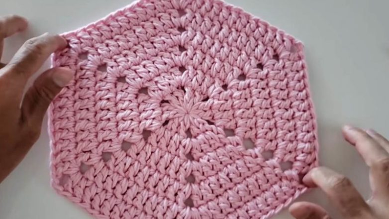 Наконец, свяжите 4 ряд точно таким же образом. Как можно догадаться, вы можете увеличивать шестиугольник в размерах, просто провязывая каждый ряд аналогично предыдущему, однако, количество ССН в каждом ряду будет увеличиваться само собой. Когда свяжете шестиугольник нужного размера, отрежьте нить и спрячьте её в вязании.