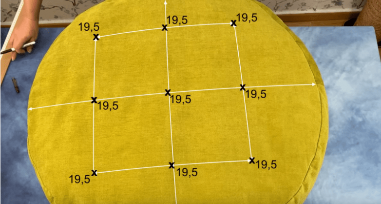 Отверстие для набивки закрываем потайным швом и в принципе пуфик готов. Однако его можно немного украсить, например, стяжкой. Для этого на верхнюю часть пуфика наносим разметку стяжки, намечая точки ее расположения.