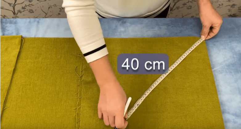 Для пуфа лучше всего брать достаточно плотную, неэластичную ткань. В нашем случае был взят отрез 180 см на 140 см. Его складываем вчетверо, вторую своротку делаем наподобие створок. От одного из верхних углов рисуем полуокружность с радиусом 40 см. Сделать это можно при помощи обыкновенной линейки или метра. Повторяем все то же самое и со вторым углом.
