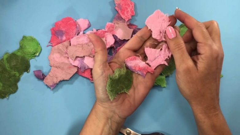 Из полотна вырежьте лепестки, листья, просто порвите на небольшие кусочки.