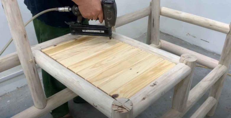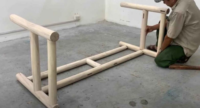 Сначала собираем две боковины скамейки. После этого соединяем их при помощи деревянных кругляков, как показано на фото.
