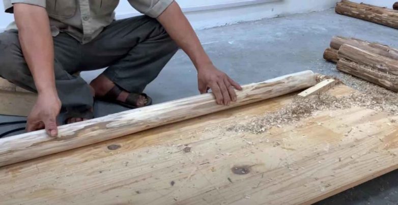 Первым делом необходимо удалить с бревен кору, а потом — обрабатываем кругляки электрорубанком.