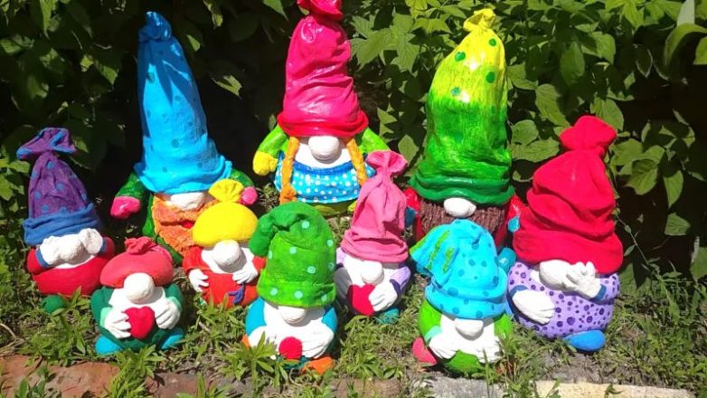 Готовую работу не забудьте покрыть лаком, так как она будет находиться на улице. Гномы долго будут радовать вас своим забавным внешним видом!