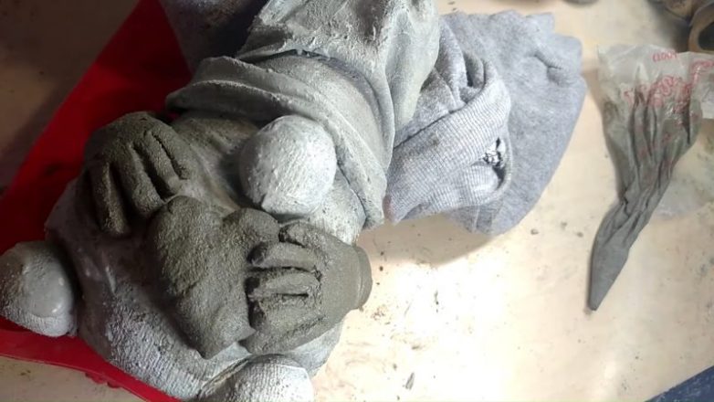 Для шапки используйте либо большой носок, подвернув его снизу, либо отрез рукава, штанины и т. д. Ткань следует предварительно смочить в цементом растворе и надеть на гнома. Оставить на сутки-двое для высыхания.