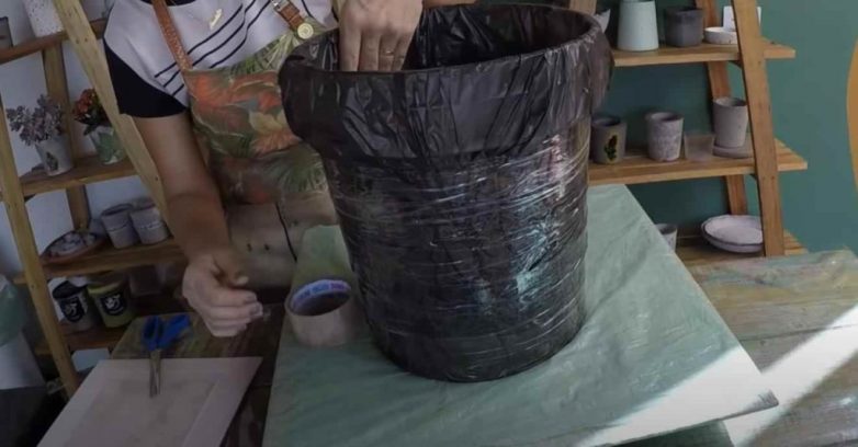 На пластиковое ведро надеваем полиэтиленовые пакет, после чего обматываем все скотчем, как показано на фото ниже.