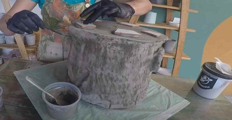 Пока раствор не затвердел, на его поверхности необходимо будет сделать древесную фактуру. Какую именно — на ваше усмотрение.