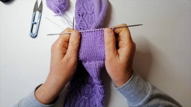 Свяжите чулочной вязкой эти ряды. Лучше вязать с запасом. Чулочная вязка делается следующим образом: лицевые петли вяжутся лицевыми, а изнаночные — изнаночными.