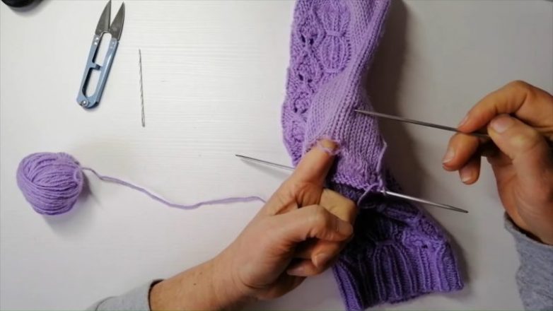Для этого примерно на 1 см ниже дырки на пятке сделайте набор петель по одному из рядов на носке. Захватывайте петли с запасом по краям, так как будущая латка должна полностью перекрывать дырку сверху, снизу, а также слева и справа.