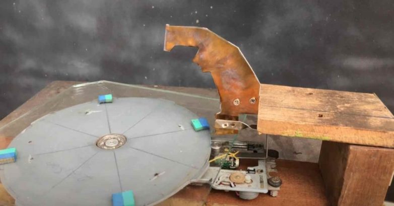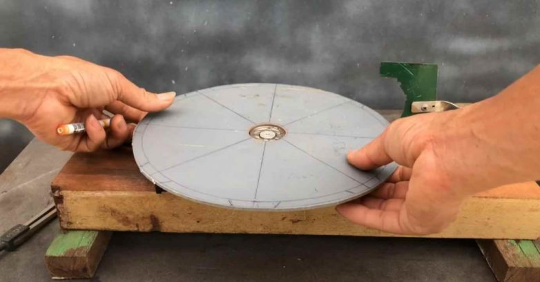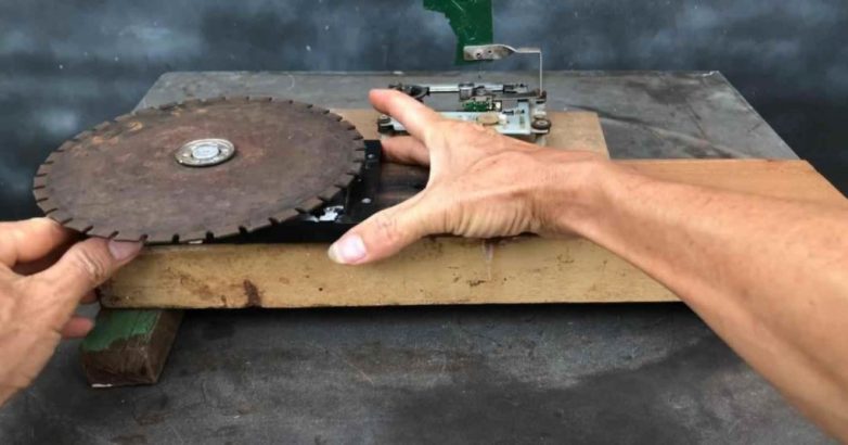 Автор разобрал жесткий диск от компьютера, удалил магниты и сам диск. Вместо диска он установил диск для циркулярной пилы.