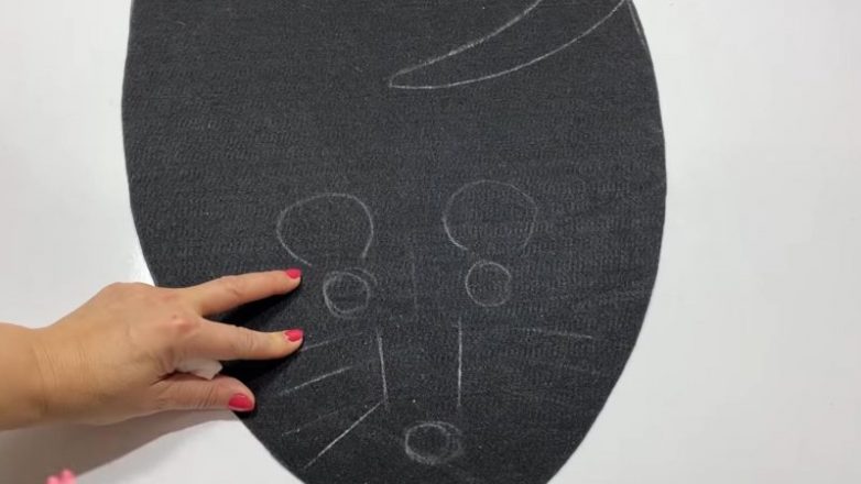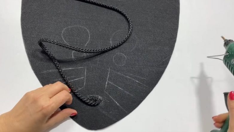Из фетровой ткани вырежьте овальную деталь. Нарисуйте мылом мордочку мышки. Глаза, ушки, нос, усы и хвост выделите чёрной верёвкой, приклеенной на горячий клей.