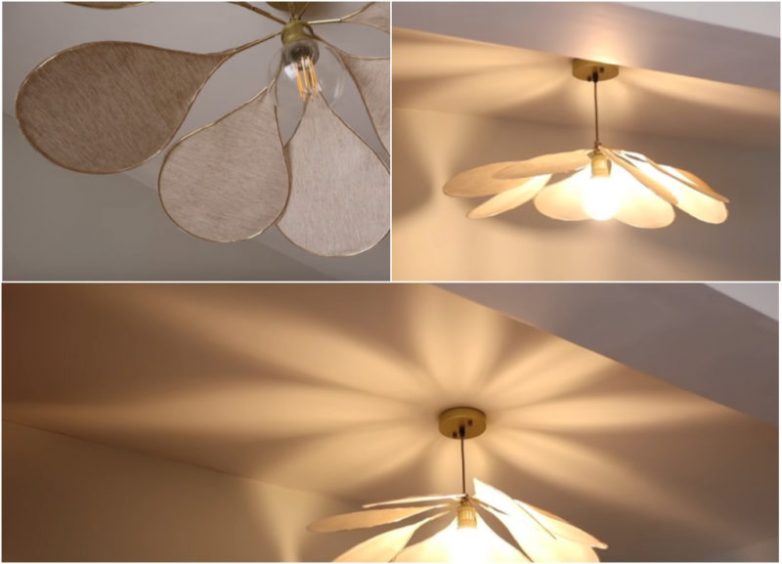 Вот и все, оригинальный светильник готов, теперь осталось только подвесить его, распределить лепестки и можно любоваться волшебными рисунками на потолке. Винтажная же лампа Эдисона сделает такую люстру еще интереснее.