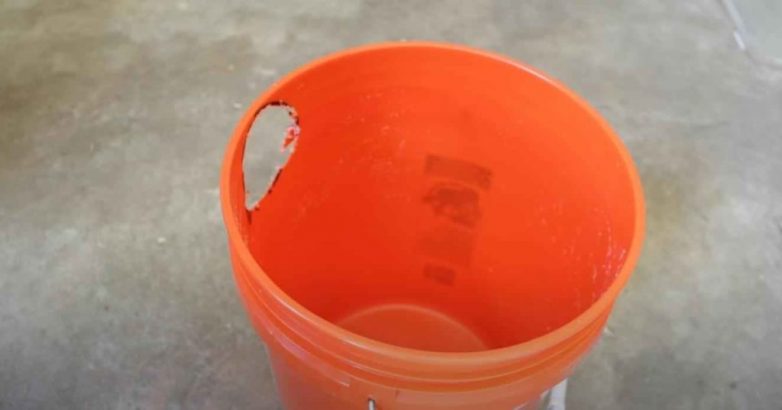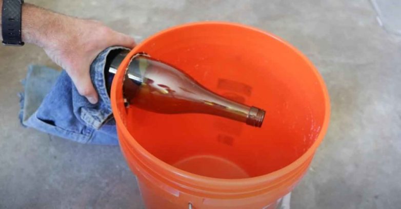 Первым делом необходимо будет вырезать в верхней части пластикового ведра отверстие, чтобы можно было установить стеклянную бутылку.