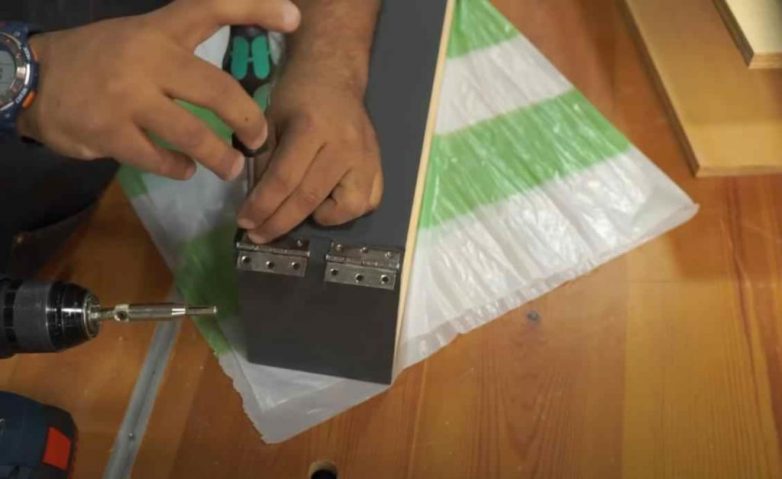 На следующем этапе на одной из стенок ящика выбираем паз, и прикручиваем мебельные петли. Прикручиваем ящик к внутренней части полки.