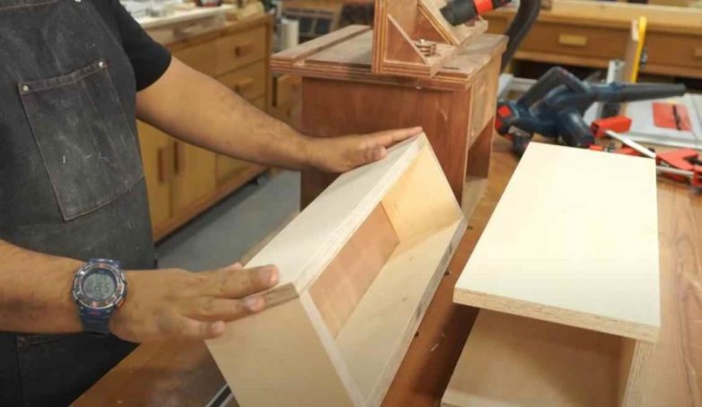 В первую очередь необходимо будет собрать саму полку.Для этого отпиливаем три заготовки из фанеры (можно и доску использовать), и затем соединить их вместе, как показано на фото ниже.