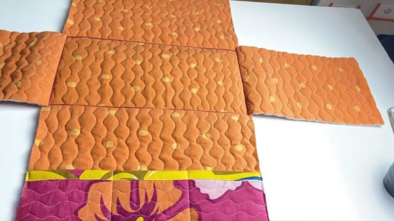 Согласно схеме, возьмите деталь, которая предназначается для органайзера, разделите на 3 или более частей, как вам нужно, пришейте к центральной ткани. Также прошейте по линиям, чтобы разделить ткань.