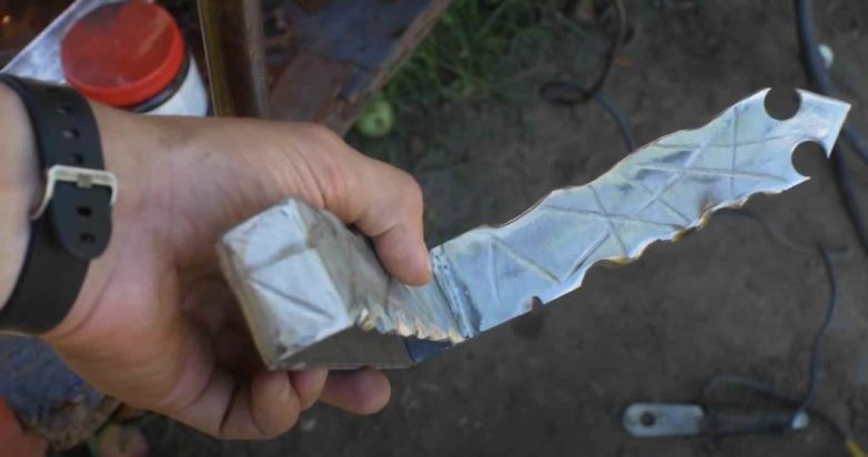 Для этого с помощью болгарки мастер сделал на заготовках надрезы в разных направлениях. На стойках кронштейнов автор вырезал наконечники.