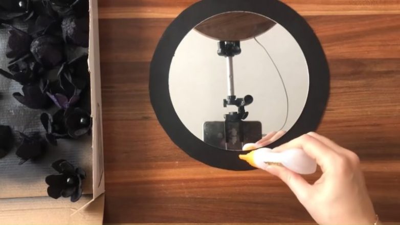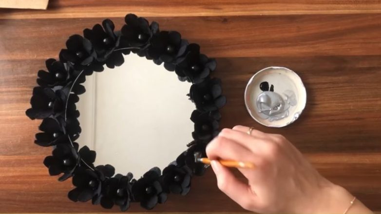 Первая идея применения таких цветов — для декора зеркала. Простое зеркало без обрамления приклейте на картон чуть большего диаметра (используйте качественный клей), покрашенный в желаемый цвет краской.