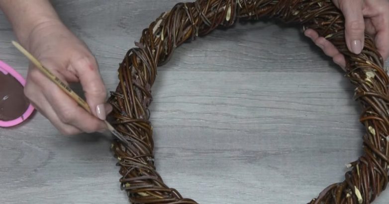 Сформируйте из гибких веток объемный плотный венок. Для фиксирования веток используйте более длинные тонкие прутики. Все несовершенства на ветках замаскируйте с помощью акриловой краски подходящего цвета.