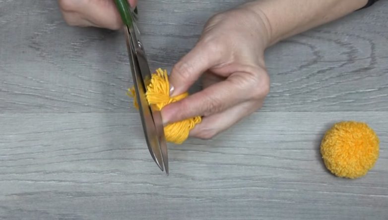 Снимите нити с картонной заготовки, перевяжите посередине и разрежьте закрытые концы. Подравняйте нитки, чтобы получить аккуратный круглый помпон.