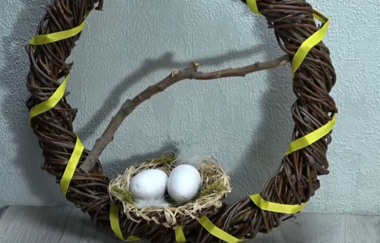 К нижней части венка приклейте гнездышко. Дополните гнездышко перьями и декоративными яйцами из пенопласта. Закрепите в центре венка толстую ветку с помощью горячего клея.