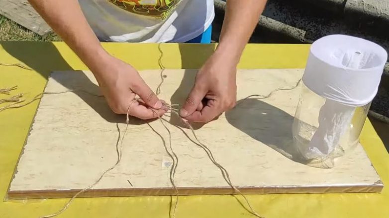 Возьмите колготки. Разведите жидковатый песочно-цементный раствор. Отрежьте 4 равные джутовые верёвки.