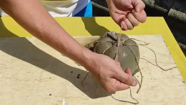 Положите колготки с цементом внутри на джут. Завяжите сверху так, чтобы получилась форма тыквы. Оставьте на несколько суток для высыхания.