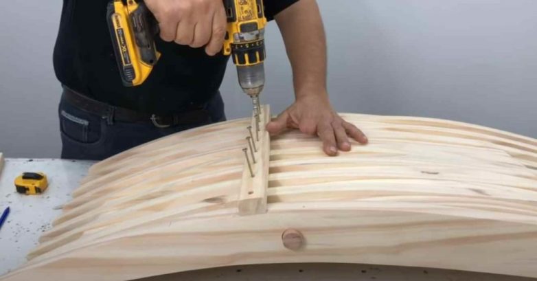 Детали можно вырезать из широкой доски или мебельного щита. Размечаем заготовки, и высверливаем в них отверстия.