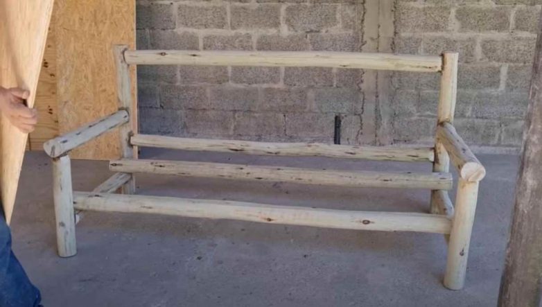 На следующем этапе можно приступать к сборке диванчика. Сначала автор собрал две боковых стороны каркаса. Затем соединил их длинными бревнами.