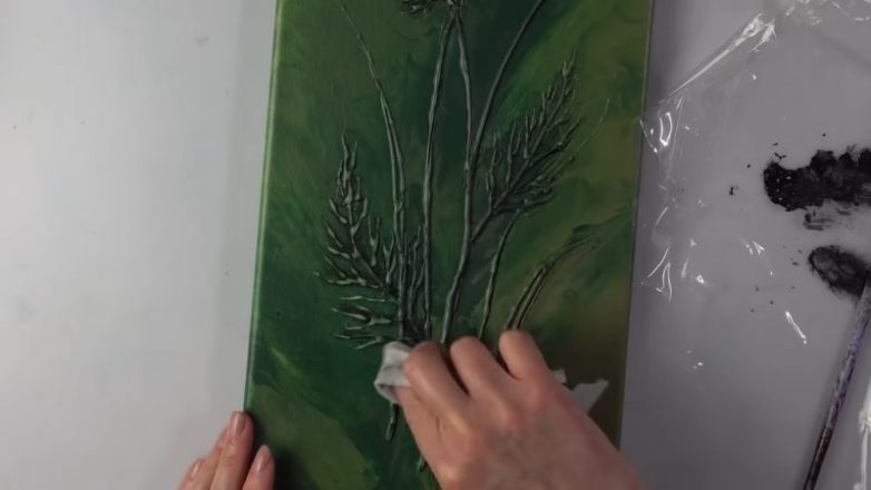 Оставьте холст сохнуть. Вот такой красивый фон и выпуклые цветы получились! Теперь нужно оттенить цветы. Для этого тонкими полосками наносите чёрную краску на цветы и тут же вытирайте платком.