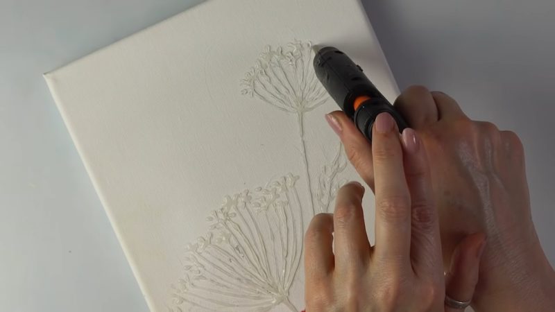 На холсте нарисуйте цветы. Можно нарисовать абсолютно любые, самые простые и даже схематичные. Можно перерисовать с фотографии. Затем, когда простой рисунок готов, возьмите клей-пистолет и горячим клеем обрисуйте все детали цветов. Дайте клею полностью высохнуть.