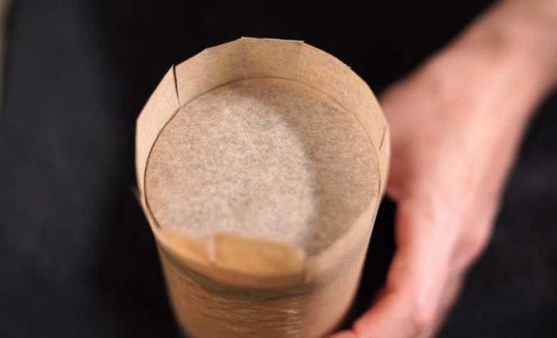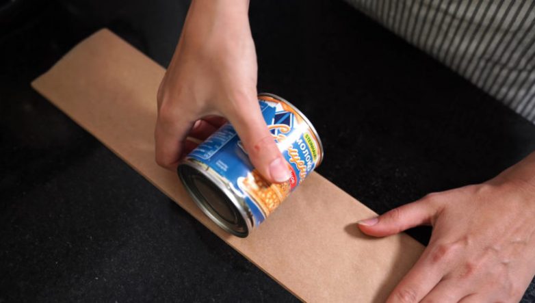 Оберните консервную банку пергаментом и срежьте излишки бумаги, оставляя небольшой припуск для склеивания краев.