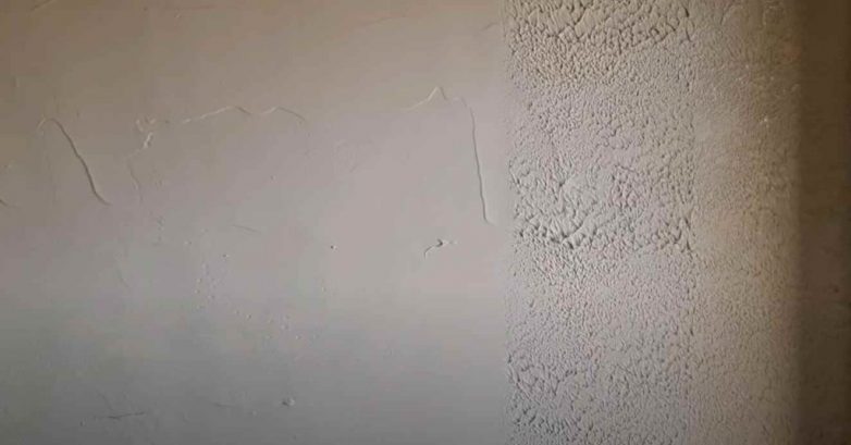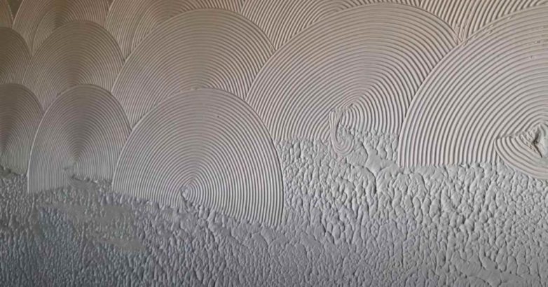 На подготовленную прогрунтованную поверхность стены наносится слой декоративной шпаклевки. Толщина слоя — 2-3 мм.