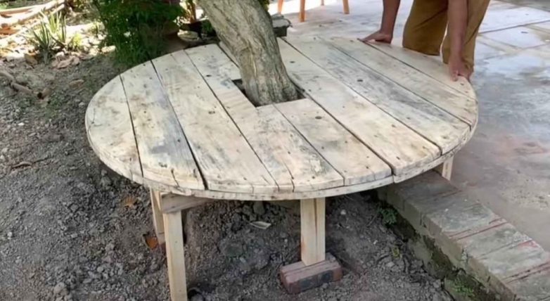 Идею изготовления самодельной круглой скамейки со столиком вокруг дерева мы подсмотрели у автора YouTube канала.