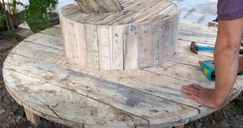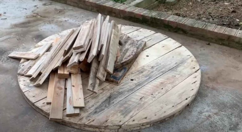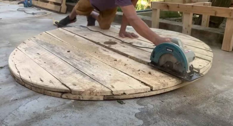 Конкретно в данном случае мастер использовал деревянную катушку для электрокабеля. А точнее — ее боковую часть. Необходимо будет удалить все гвозди и отшлифовать наружную поверхность.