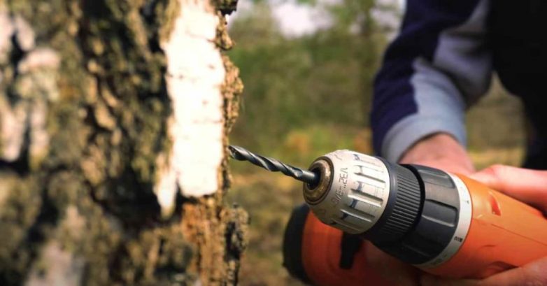 На стволе дерева удаляем слой коры, потом с помощью шуруповерта сверлим отверстие — при этом сверло необходимо держать под углом, и сверлить по направлению сверху вниз.
