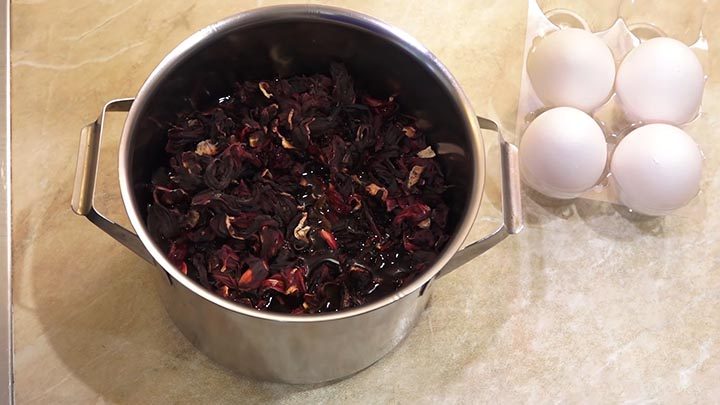 Упаковку чая каркаде (80-100 гр.) залейте 700 мл воды. Белые яйца отмойте от грязи и меток, переложите в воду с каркаде.